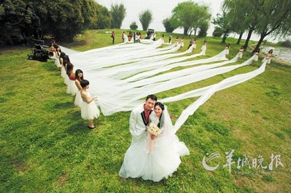Ngày 16/4, tại vườn thực vật ở thành phố Vũ Hán, Trung Quốc, một cặp đôi đang tạo dáng chụp ảnh chiếc váy cưới dài 520m với sự hỗ trợ của 20 phù dâu xinh đẹp.